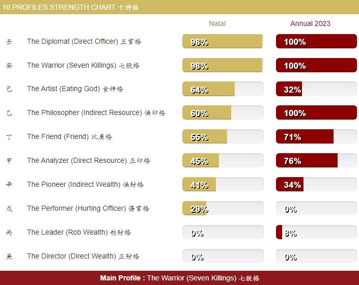 Those with a high Seven Killings would exude a sense of power and authority. They are courageous, robust, and resilient, and no setback can slow them down. The Warrior has a talent for speedy yet accurate executions. They are also natural problem-solver. However, they can be overbearing and blunt.