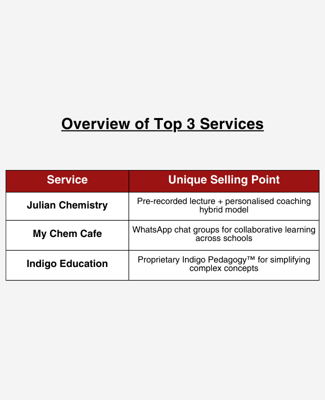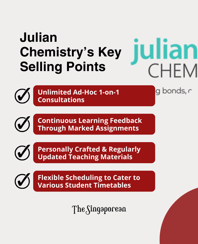 Julian Chemistry offers specialised A-Level and O-Level chemistry tuition in Singapore, focusing on personalised coaching and flexible learning through pre-recorded lectures.