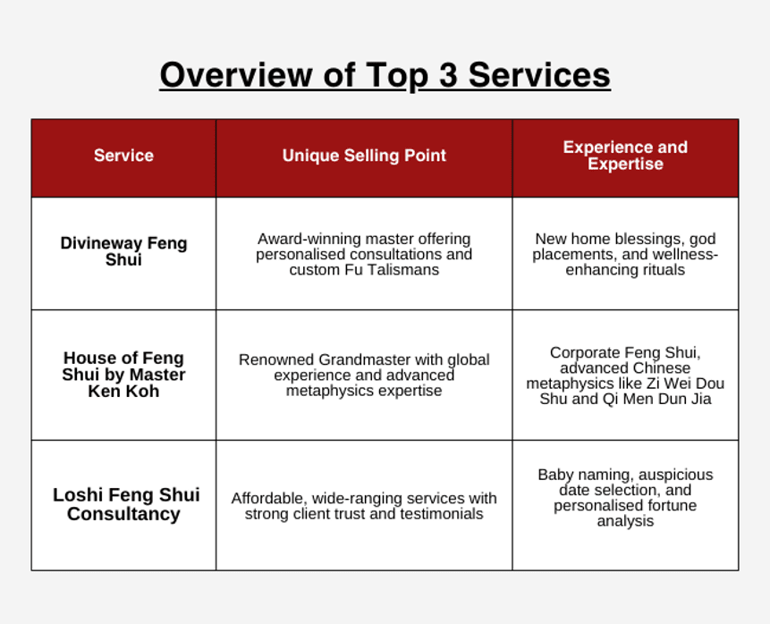 Additional services, such as Bazi (Destiny) Analysis, are typically priced around SGD 98 to SGD 138 per person.