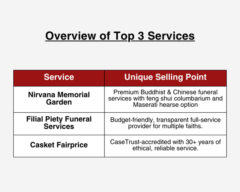 To help our readers who may be on the same journey, we’ve curated a list of reputable funeral service providers based on industry experience, customer feedback, service comprehensiveness, and transparency in pricing.